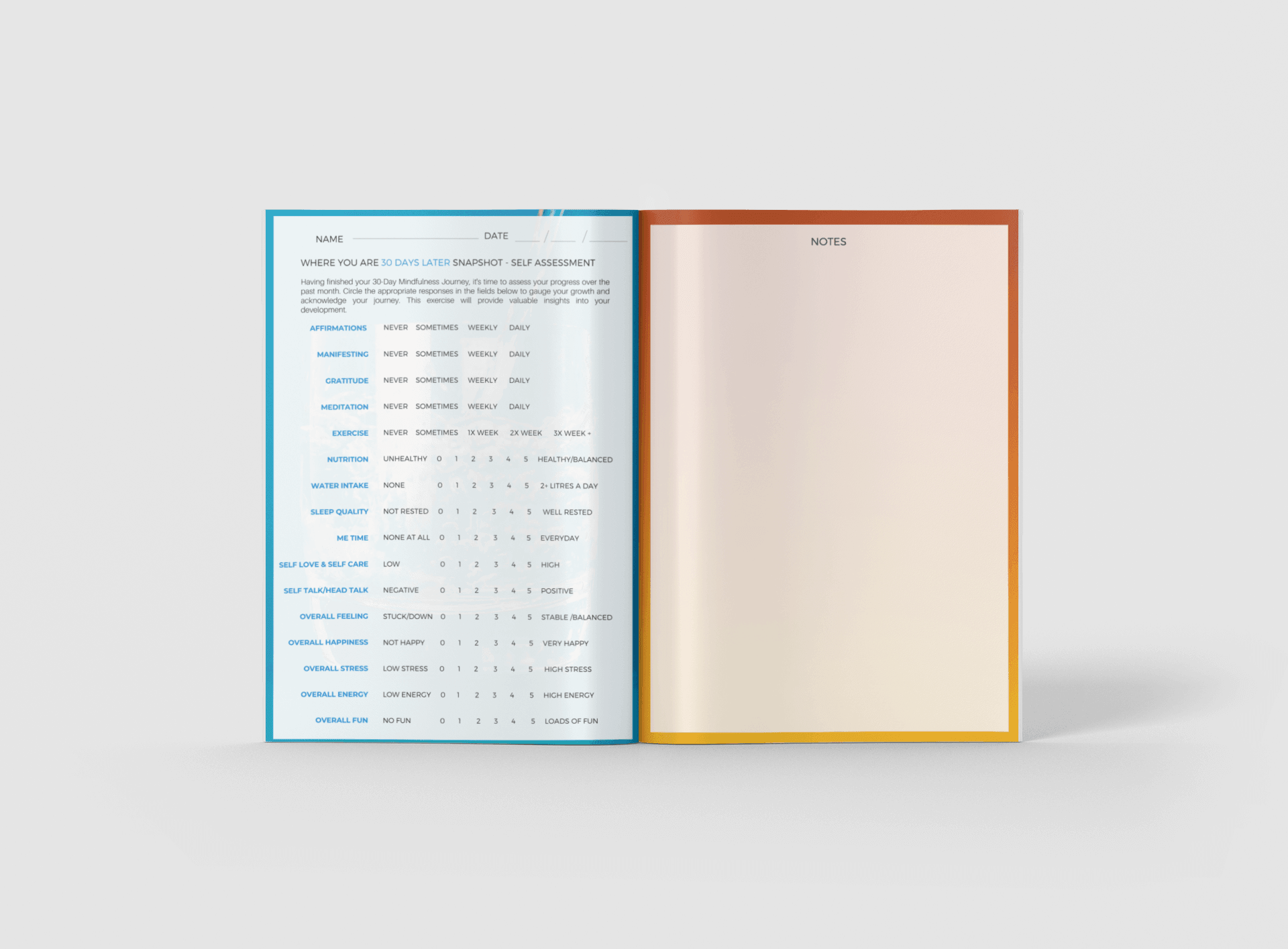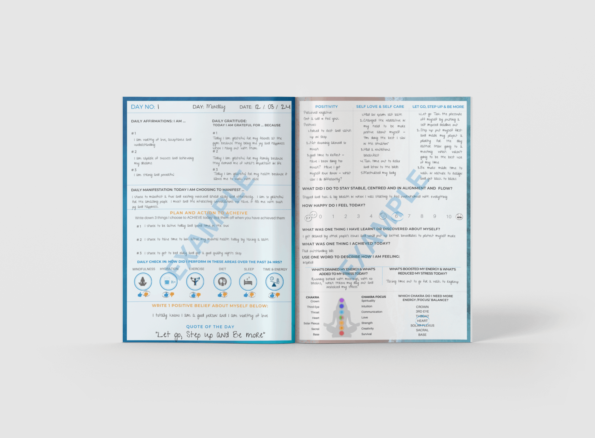The journal includes a 30-day mindful tracker, meticulously designed to cultivate affirmations, gratitude, self-love, and positive beliefs. By nurturing these qualities within yourself, you'll witness a profound shift in your well-being. Moreover, our vitality tracker empowers you to monitor your energy levels, stress indicators, and overall happiness throughout the month, giving you the insight needed to make informed choices.