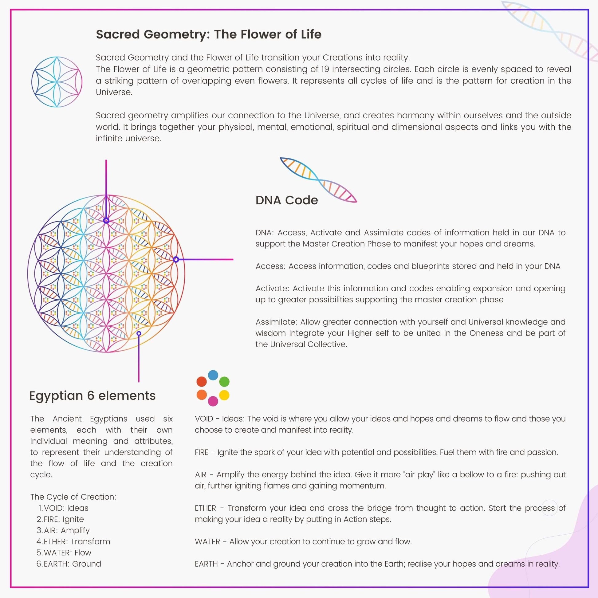 This full Print design incorporates the 3 elements of creation: DNA, Egyptian 6 elements and the Flower of Life.